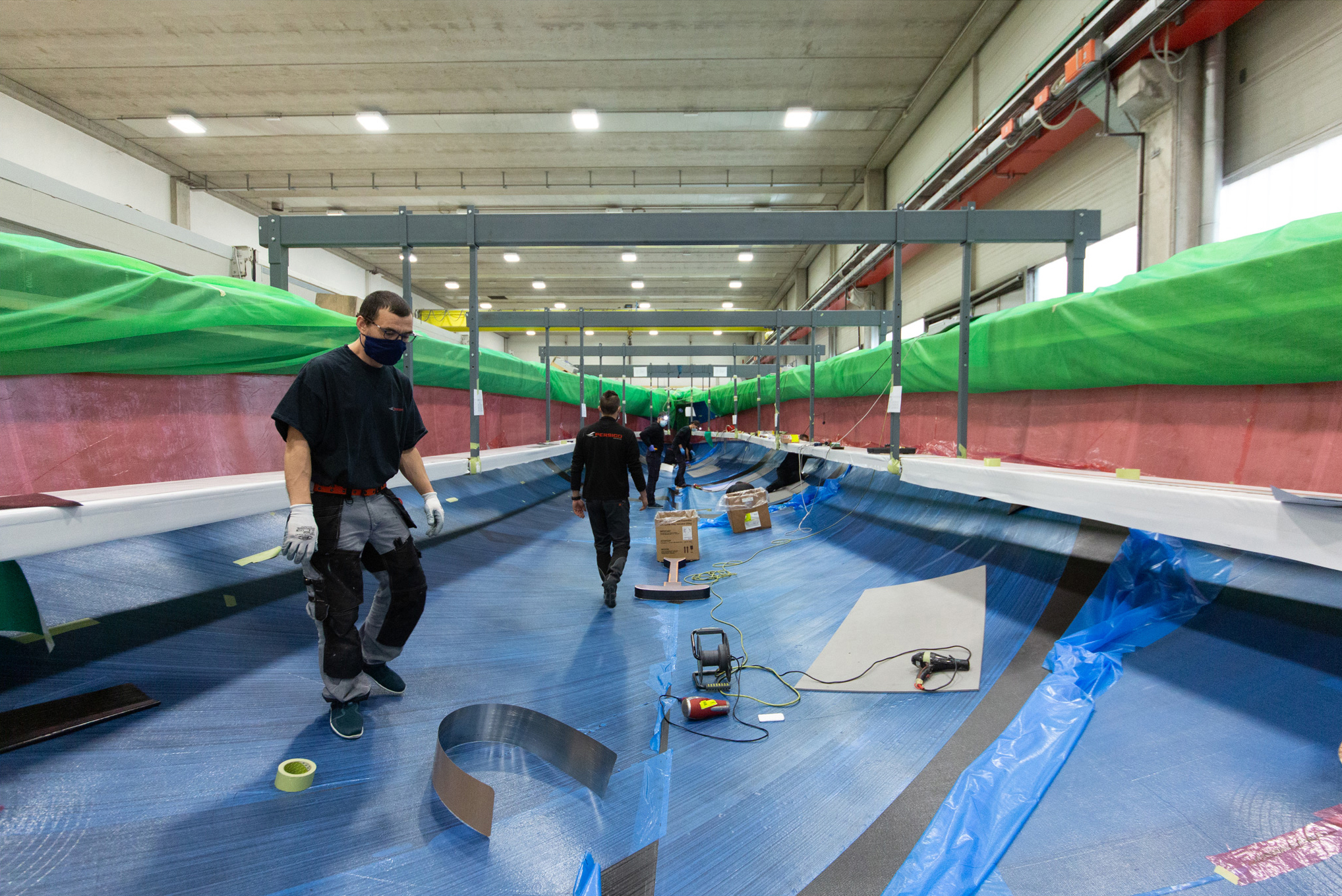 In this project, performance is a pillar of the building process. The high-tech solutions – CNC machines for machining moulds and components, a tape placement robot for lamination and a plotter for preparing the pre-cut prepreg – help to increase the quality, guarantee the consistency and optimize the construction timing of the one- design parts.